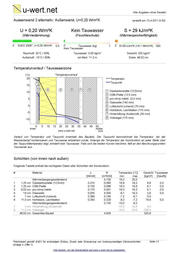 Konstruktiv: ca. 7 cm Luftschicht ca. 14 cm Mineralwolle 035 in Holzständerwand ProClima –Intello Dampfbremse 3 cm Installationsebene 1,25 cm Gipskartonplatte (siehe Bild1)
