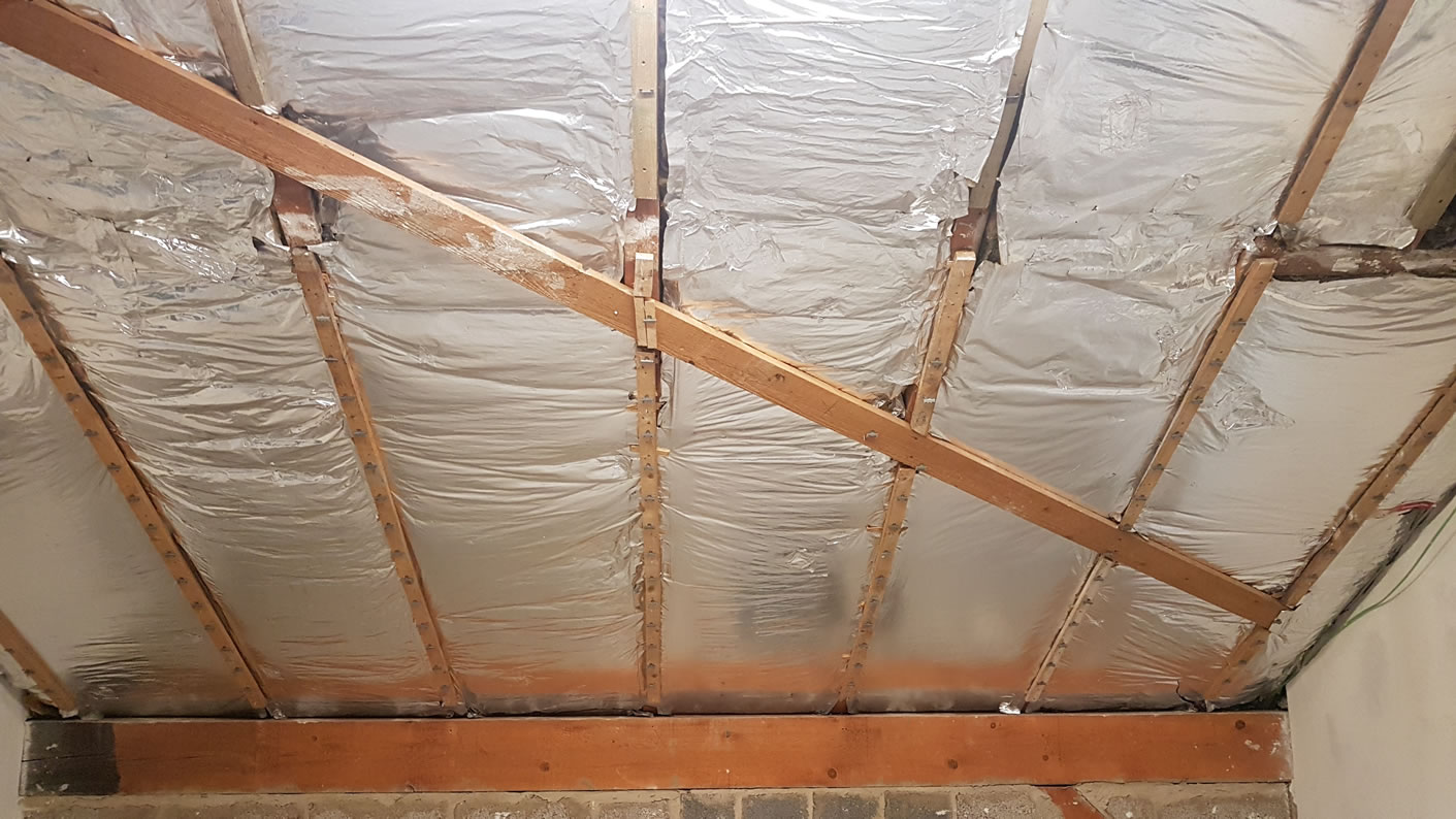 Meine Idee war nun die bestehende Löcher zu flicken, schwarze Stellen auszutauschen und darunter noch eine komplett neue Dampfbremse (ISOVER Klimamembran Vario KM Duplex UV) zu installieren um den Raum bzw. den Zugang zu Mineralwolle dicht zu machen.